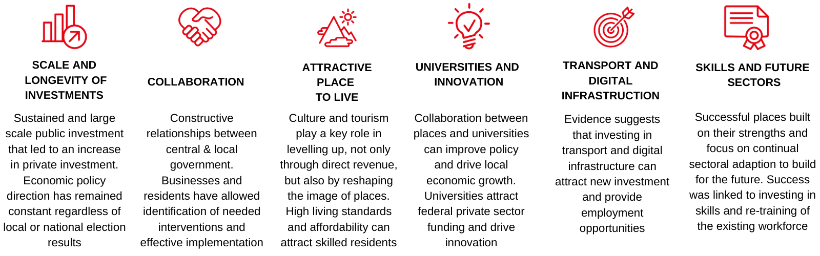 Six common factors associated with effective economic growth policies were identified, those factors are: scale and longevity of investments, collaborations, being an attractive place to live, universities and innovation, transport and digital infrastructure, and skills and future sectors.
