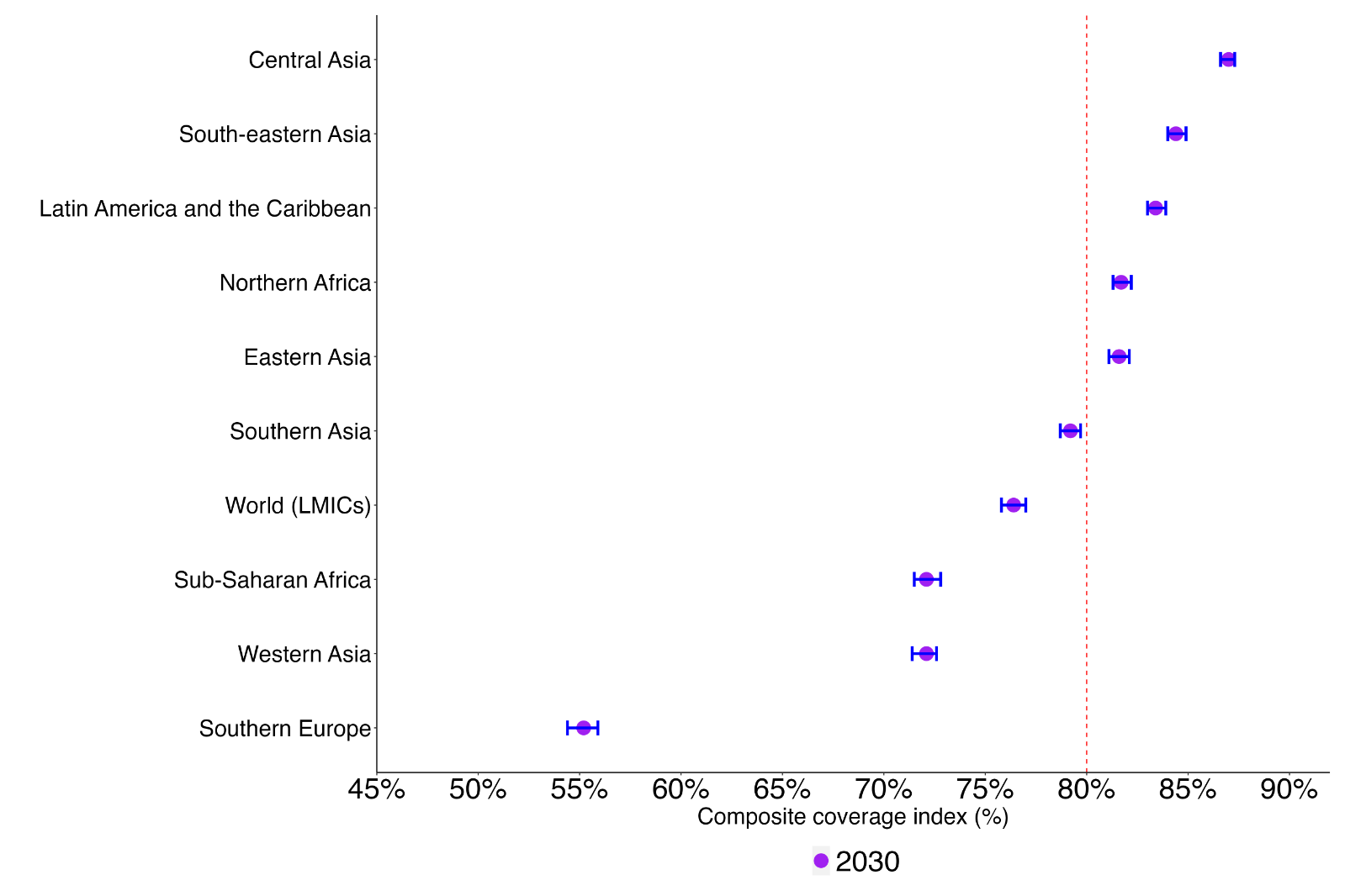 However, despite these improvements across most regions in CCI coverage of reproductive, maternal, newborn, and child healthcare services, only 18 countries will reach the actual SDG target of 80% CCI coverage by 2030.