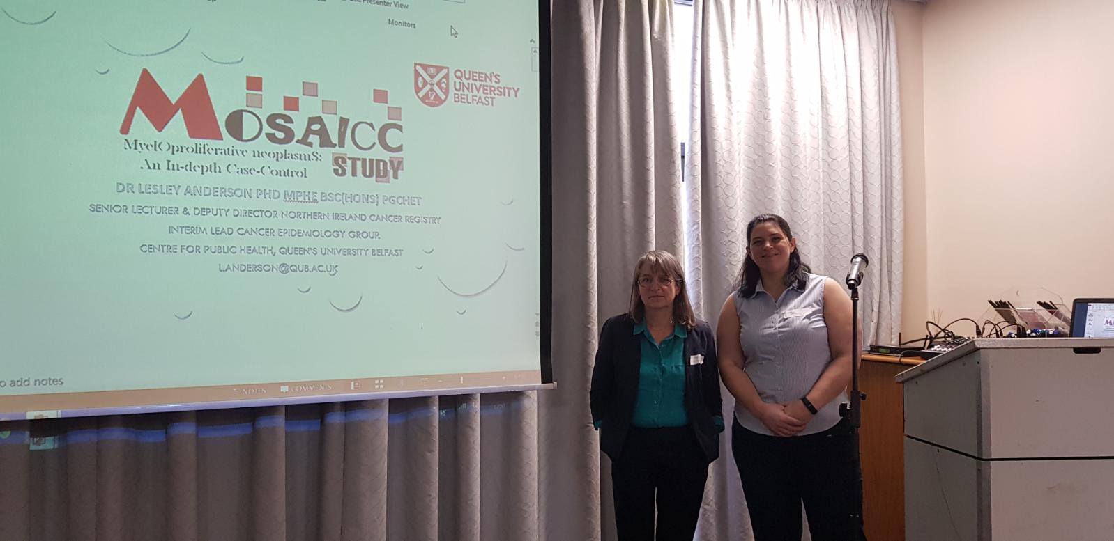 Professor Mary Frances McMullan and Dr Lesley Anderson at the MPN Voice Patient Forum, Belfast Saturday 5th October 2019. Prof. Anderson presented the MOSAICC Study to the panel members and those patients and family members in attendance.