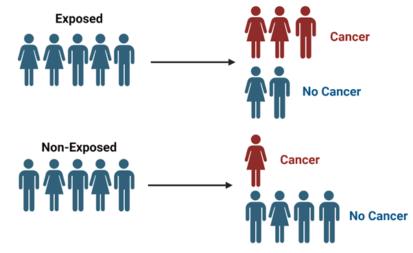 Figure 1. A simplified cohort study design in cancer epidemiology of exposed vs unexposed individuals (for example, with and without kidney stones) with the outcome on a particular cancer type.