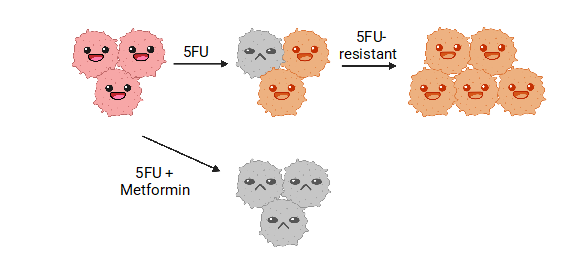5FU is effective on some bowel cancer cells, but some develop resistance and continue to grow in its presence; by adding metformin to a typical 5FU treatment, most cancer cells will not survive, showing the combination of this safe drug to our typical standard of care can be used to improve effectiveness.