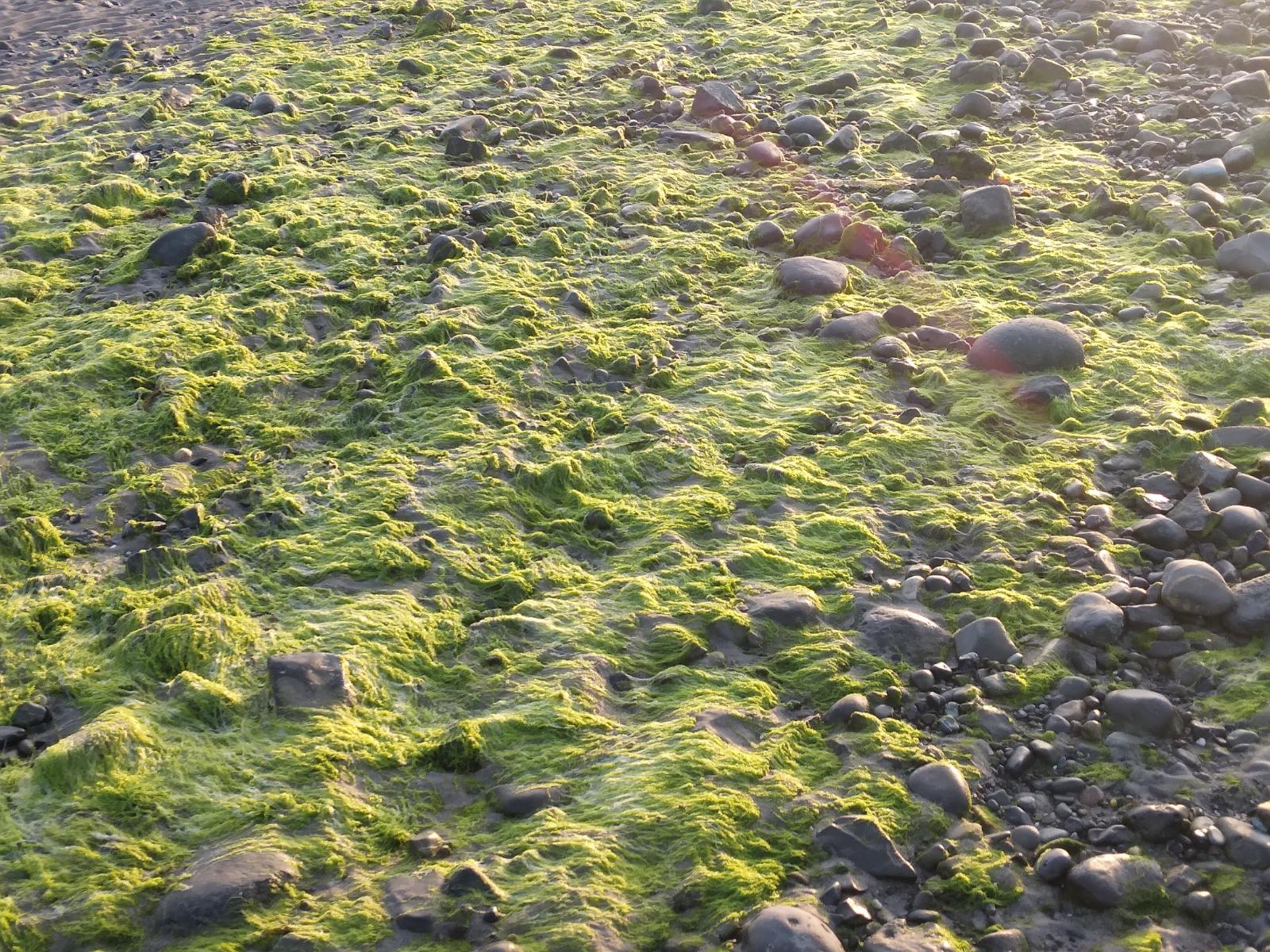 This picture is an example of green algae on the beach near my house. Algae comes in over 27,000 different varieties; it can be microscopic or large as seaweed and giant kelp.
