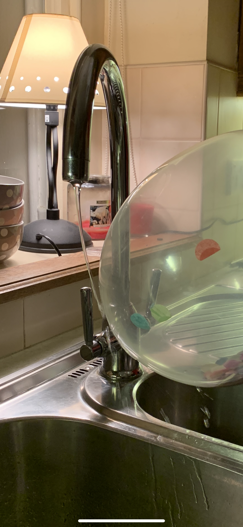 When we create static electricity with this balloon by e.g. rubbing nylon against it, the positive energy particles from the water move towards the negative energy particles from the balloon, creating a dramatic bend in the water.