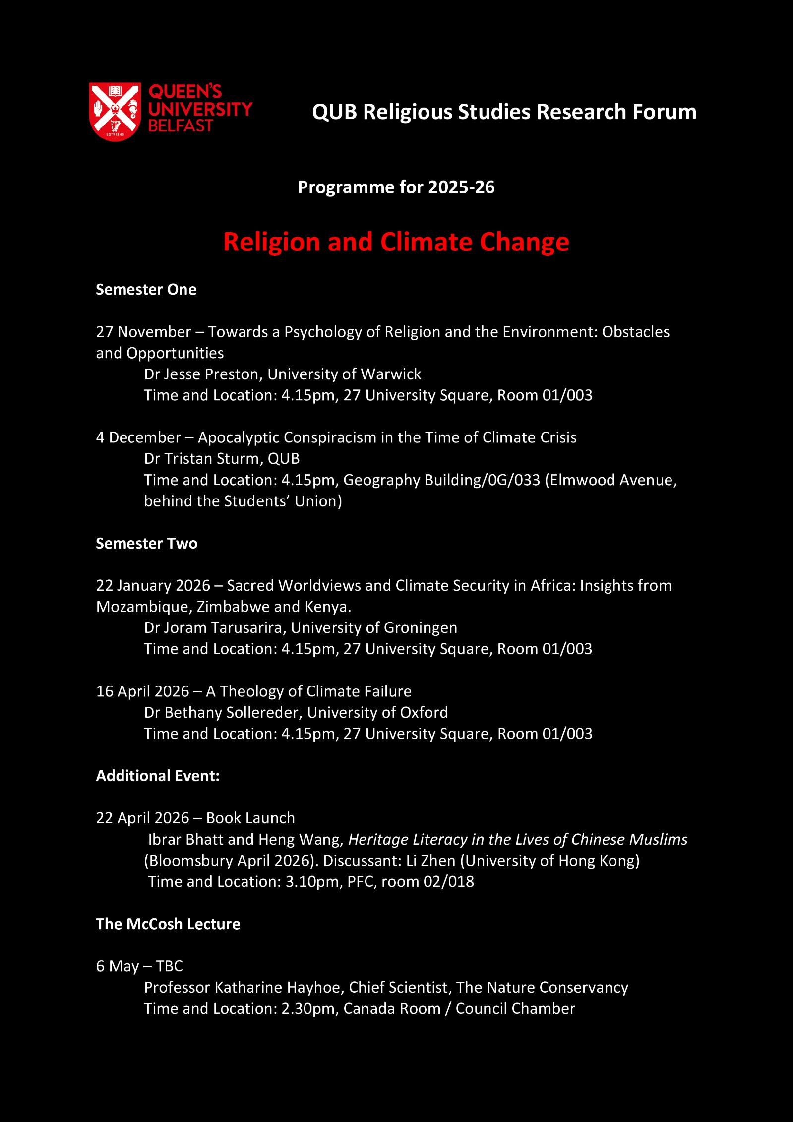 The Queen's University Belfast Religious Studies Research Forum is an interdisciplinary grouping of scholars from across the University interested in exploring themes and issues relating to religion in culture and society. The Forum sponsors the annual McCosh lecture, delivered in recent years by Onora O'Neill (2019), David Hempton (2020), Sarah Coakley (2021), Colin Kidd (2022), David Livingstone (2023), Mary Daly (2024) and Irene Tracey (2025). It also organises an annual series of research seminars in the University but open to the public.
