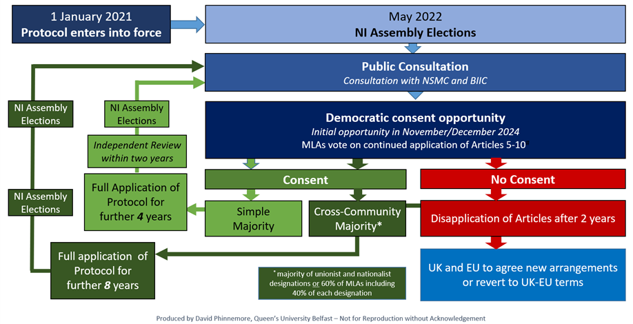 The democratic consent mechanism provides the elected members of the Northern Ireland Assembly (MLAs) with an opportunity to vote – potentially as often as every four years – on whether Articles 5-10 of the Protocol shall continue to apply.