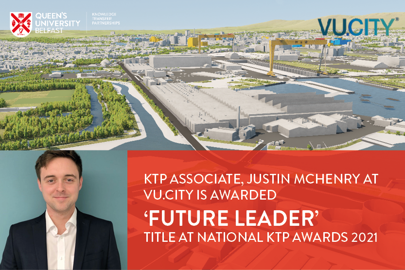 “This is an astonishing award for Justin McHenry. It has been a pleasure and privilege to work with him on this digital technology and city planning KTP. His desire and drive was absolutely fantastic, and his energy and enthusiasm was truly infectious. He fully deserves this Future Leader Award. A word for our partners too. VU.CITY and in particular CEO Jamie Holmes deserve huge credit for their commitment to the KTP. It has been an incredible experience working with VU.CITY on this KTP. This collaboration between Queen’s and VU.CITY will continue as Justin begins his PhD on the Planning-Technology Nexus”. Dr. Phil Boland