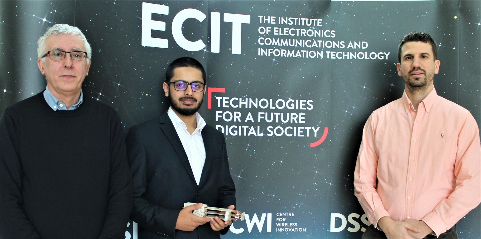 Dr Muhammad Ali Babar Abbasi accepted the grand prize of the Mobile World Scholar Challenge at Mobile World Congress in Barcelona on behalf of his Belfast-based team which includes Professor Vince Fusco, Dr Michalis Matthaiou and Dr Harsh Tataria.