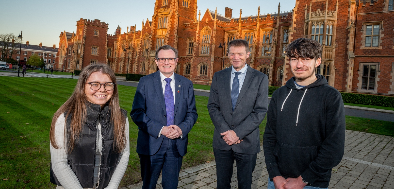 Queen’s University Vice-Chancellor Professor Ian Greer and Simon McDowell, Director of Kilwaughter Minerals with bursary recipients Maeve Shortt and Sam Patterson.