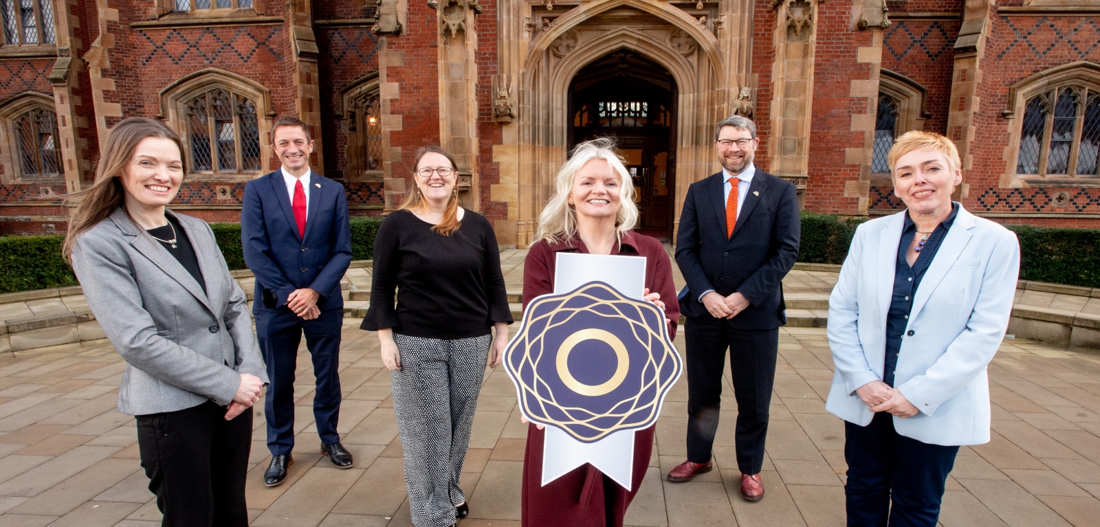 Pictured with the award are (l-r): Professor Karen McCloskey, Director of Queen’s Gender Initiative, Conor Curran, Head of Diversity and Inclusion, Queen’s University Belfast, Joanne Clague, Registrar and Chief Operating Officer of Queen’s University Belfast, Nuala Murphy, Interim Head of Business, Diversity Mark NI, Alistair Finlay, Interim Director of Human Resources, Queen’s University Belfast and Professor Margaret Topping Pro-Vice-Chancellor for Internationalisation, Queen’s University Belfast