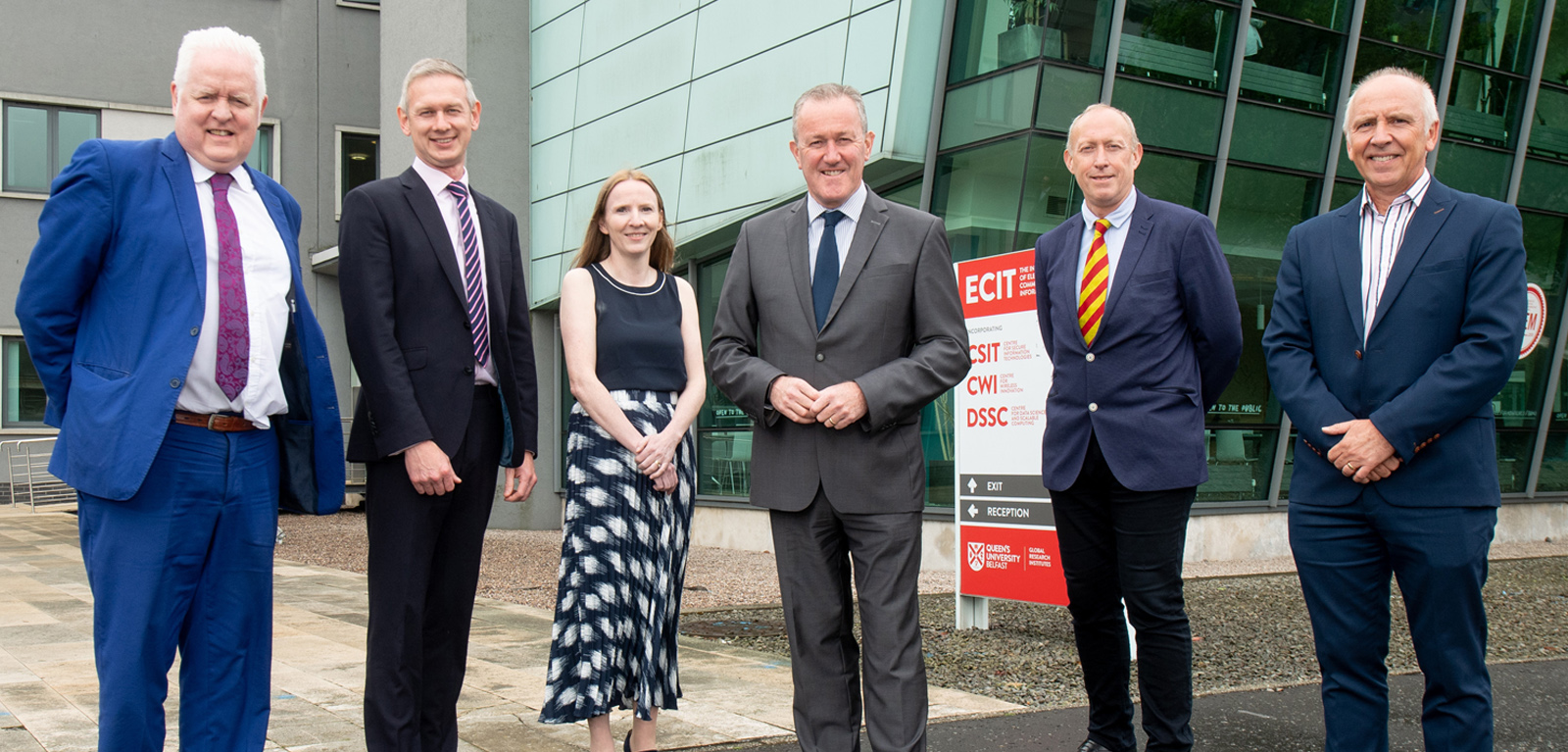 Photographed left to right are: Professor Mark Lawler, Scott Rutherford, Professor Máire O'Neill, Minister Conor Murphy MLA, Professor Chris Johnson, Dr Godfrey Gaston.