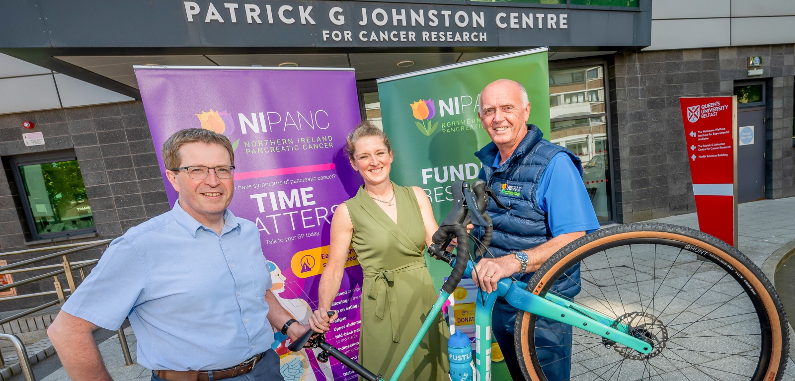 Professor Scott met with Ivan McMinn, Chairperson of NIPANC and endurance cyclist, Cathy Booth at the Patrick G Johnston Centre for Cancer Research at Queen's University Belfast.