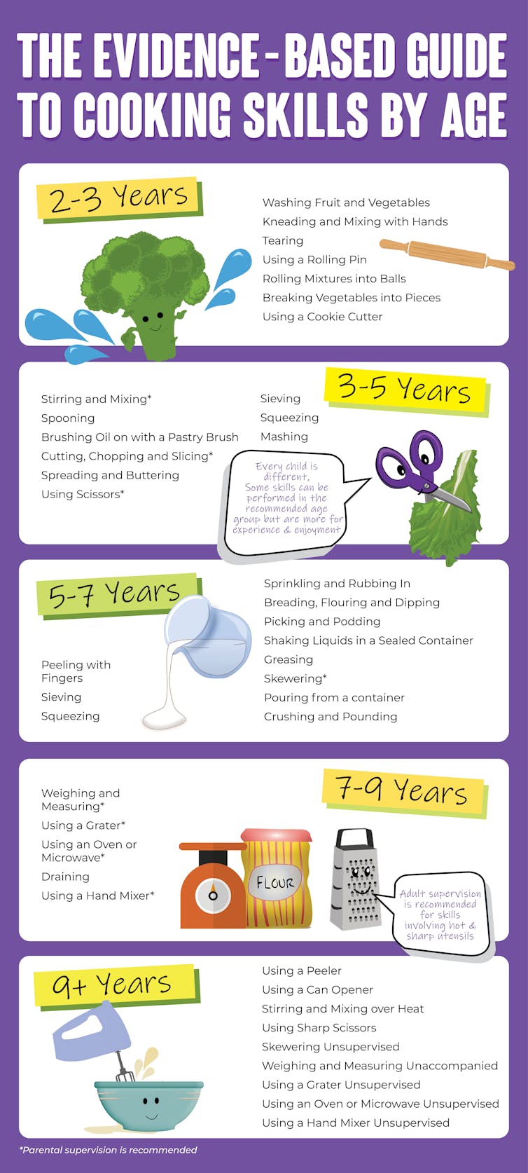 But parents often worry about the safety of involving their children in the kitchen. To help ease this fear, we have developedage-appropriate recommendations for children by breaking down cooking skills into the developmental skills needed to complete each task.