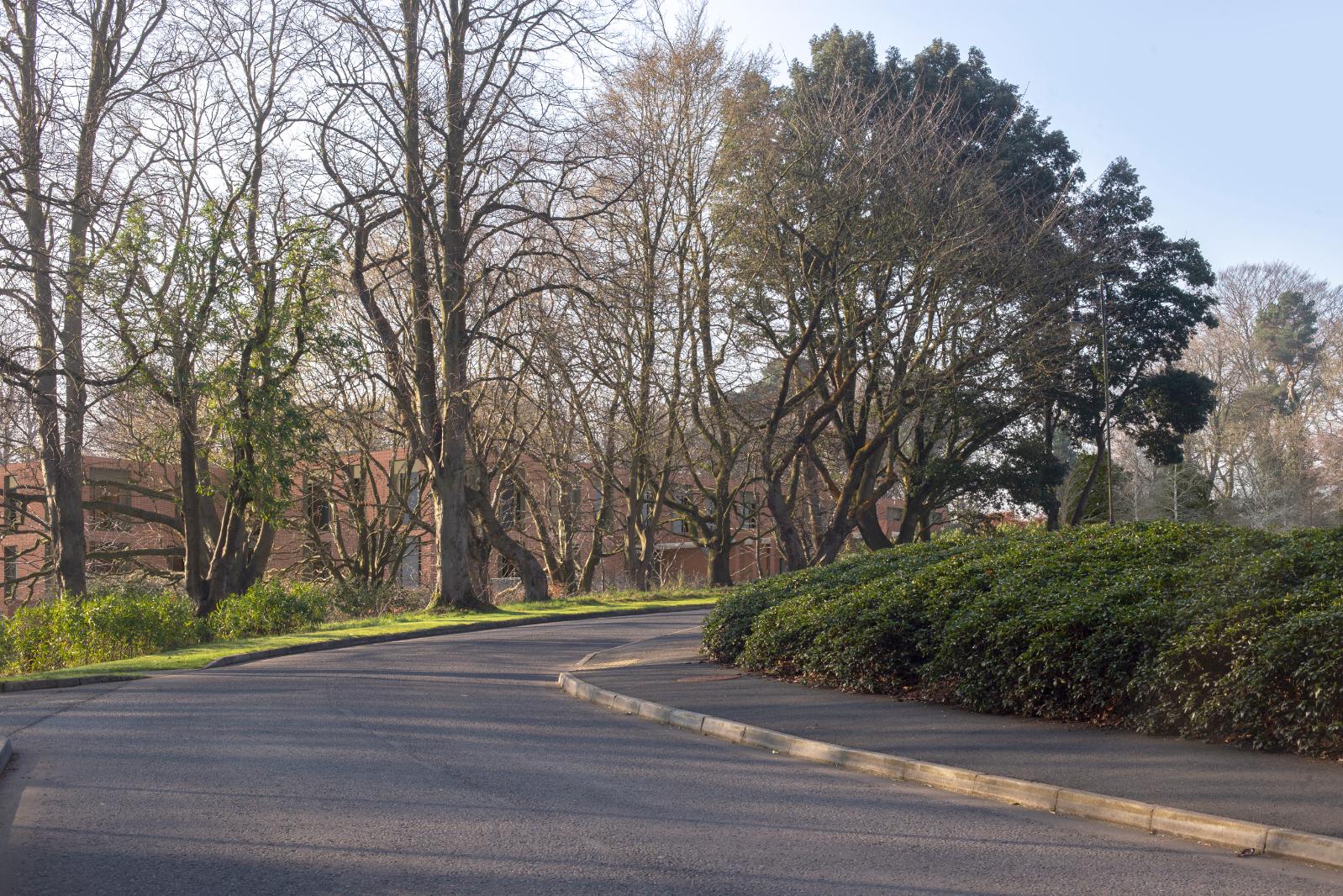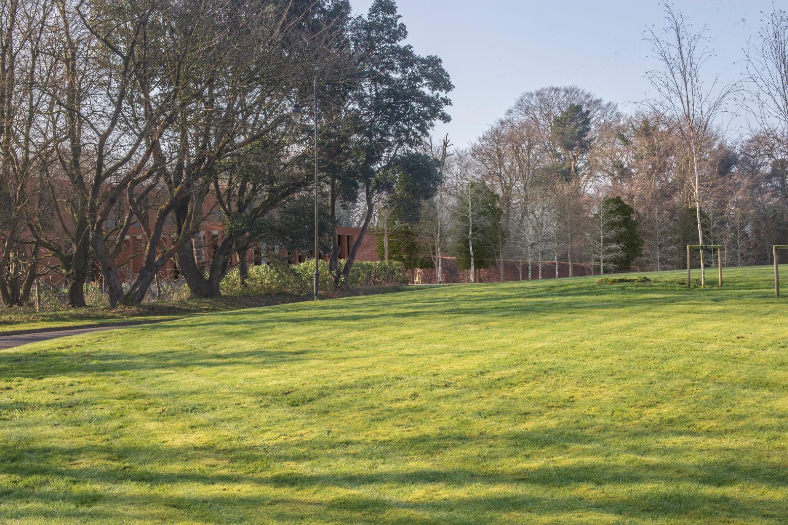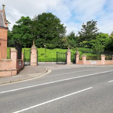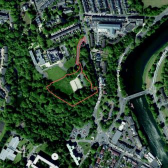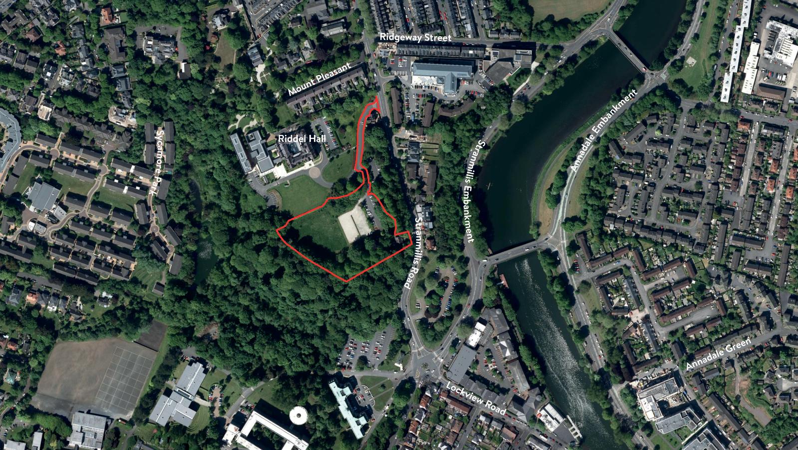 The site is located due south of the main Riddel Hall building on a lower lying section of the grounds. The site is well screened from Riddel Hall by an existing hedgerow that runs along the top of the bank. There is a c4.8m drop between the site and the upper-level lawn area. The site is bounded to the south and west by dense woodland and includes existing car parking facilities to the west which provide access to the site. All trees on the site are protected and the surrounding woodland area forms part of the Stranmillis College Historic Park, Garden and Demesne.