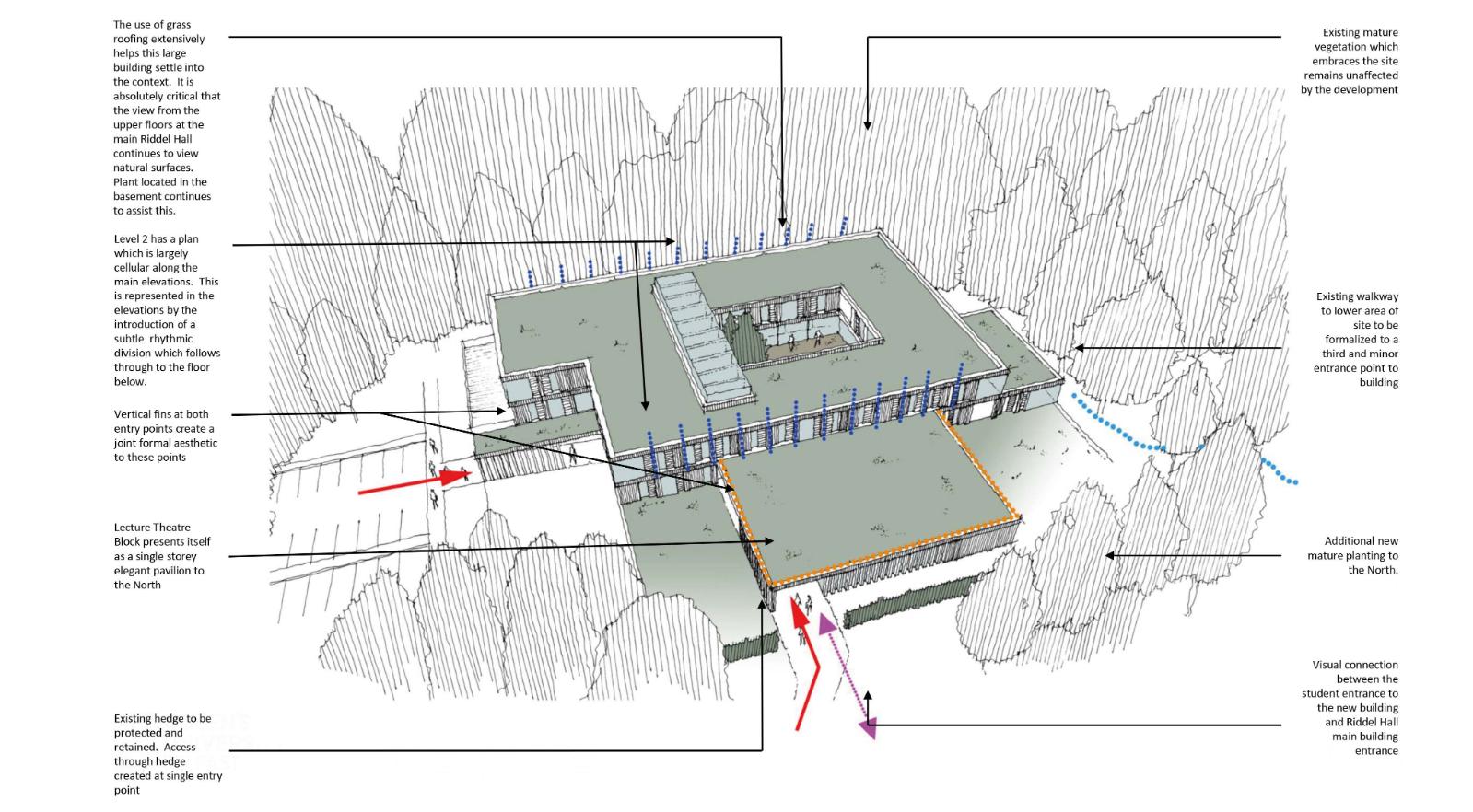 The project will provide teaching space and ancillary research, support, and social accommodation. It will also involve renovation work to the listed Riddel Hall building due to the relocation of current facilities to the new proposed space.