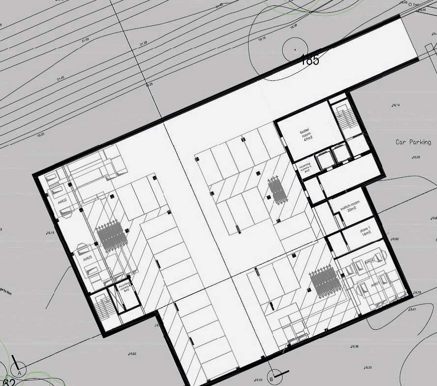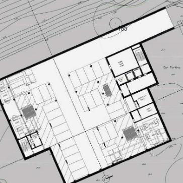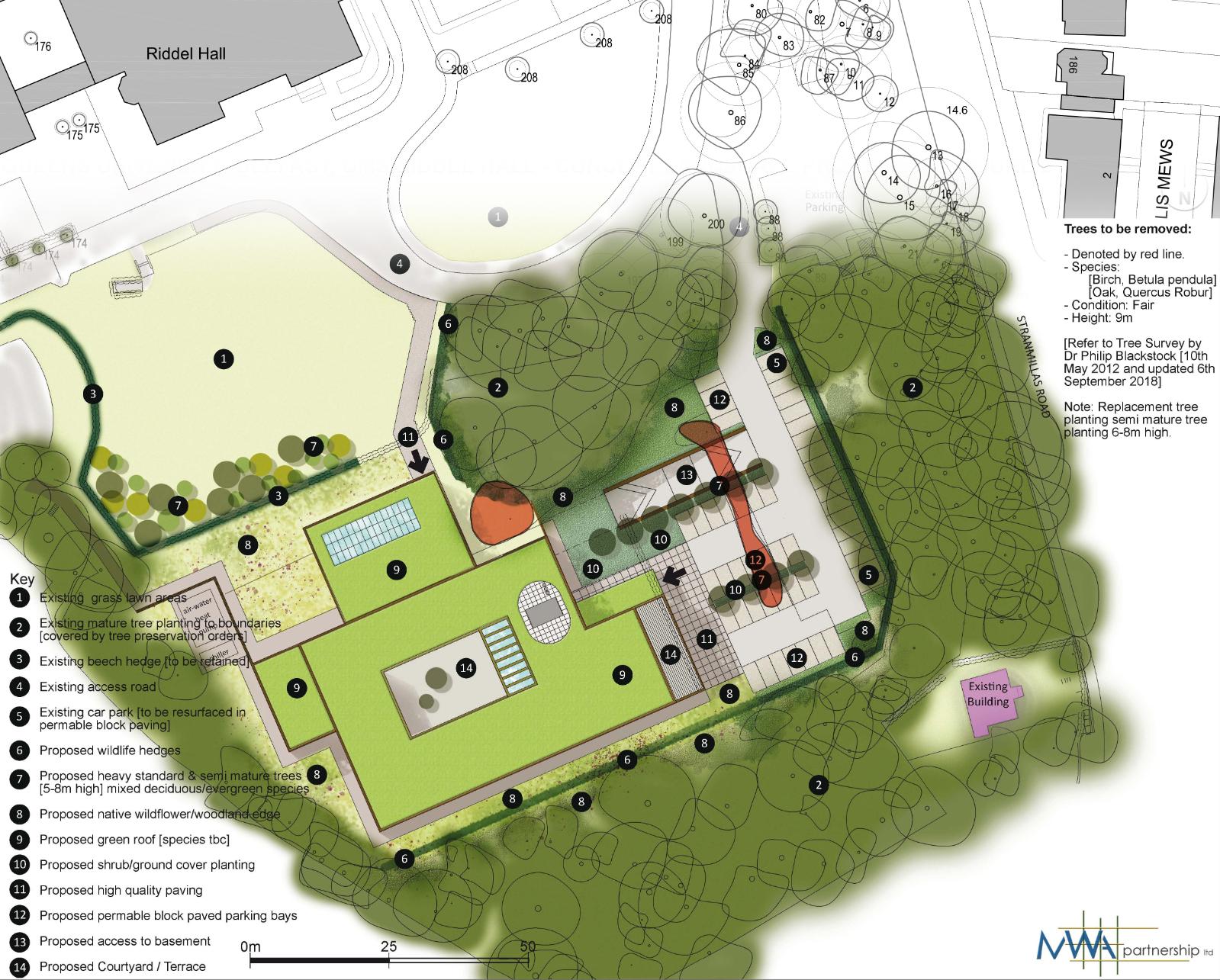 There are currently 59 formal car parking spaces in the main car park area at Riddel Hall, which is located to the immediate east of the site. 22 of these spaces will be retained and the other 37 current spaces will be reconfigured as part of the proposal that will increase surface car parking provision to 73 spaces. In addition, a further 25 car parking spaces will be provided in the basement, increasing the total provision of spaces on the site by 39 to 98 in total.
