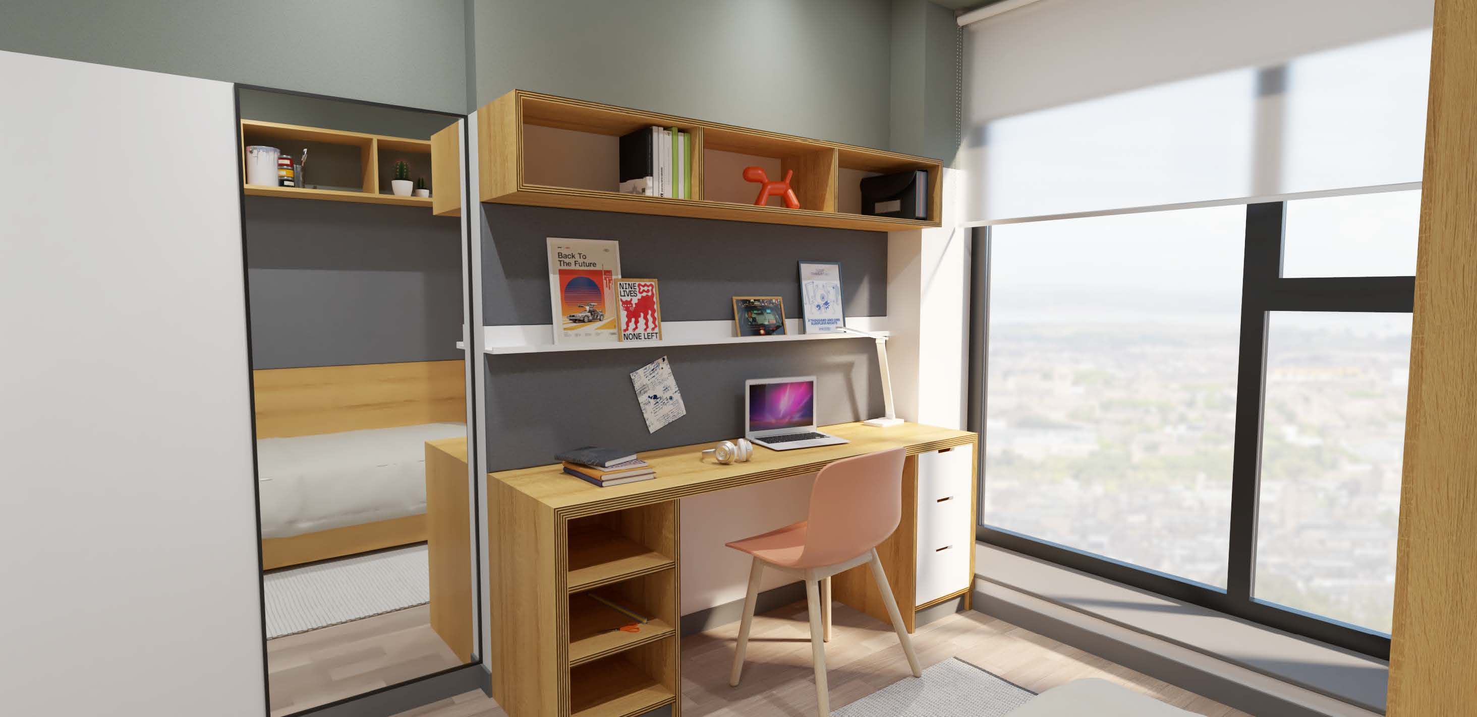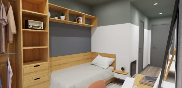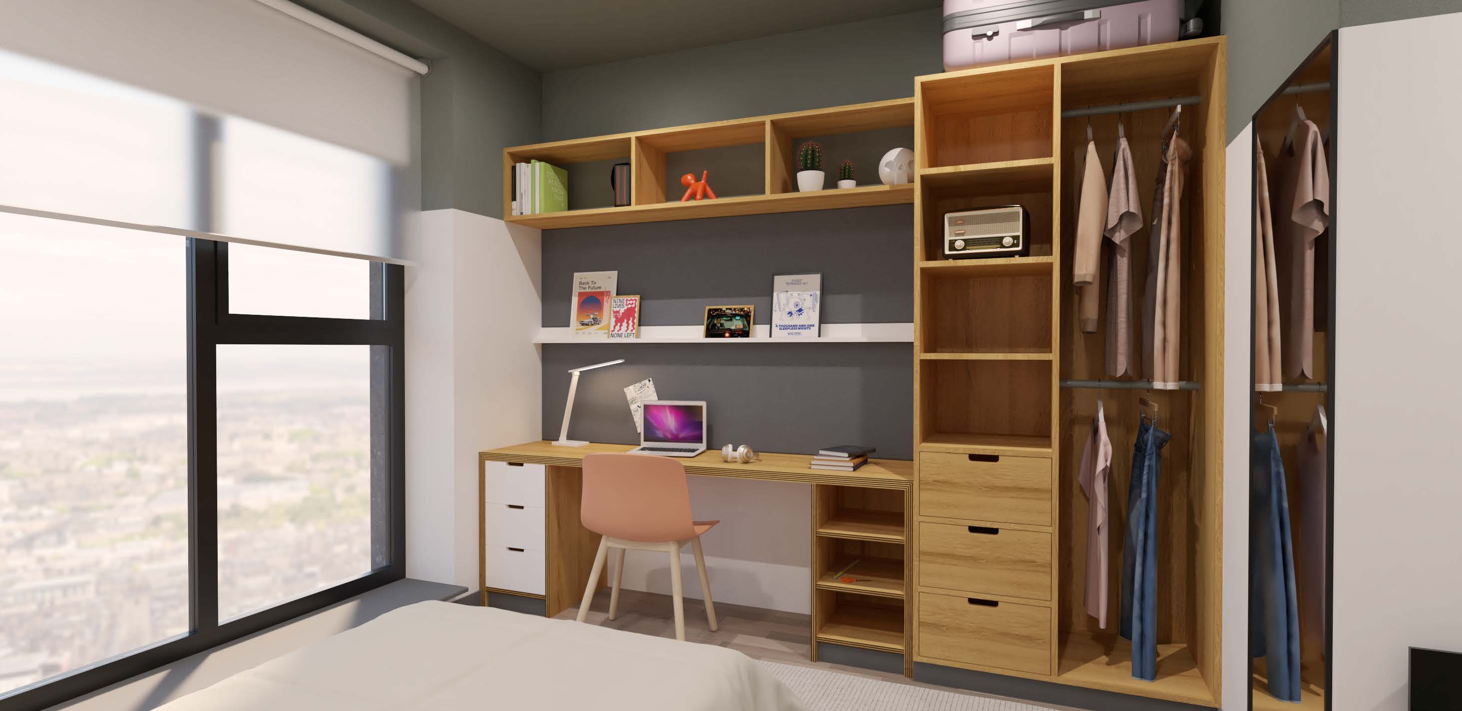Rooms are modern and spacious with wardrobe, shelving, study desk and chair, mirror and underbed storage.