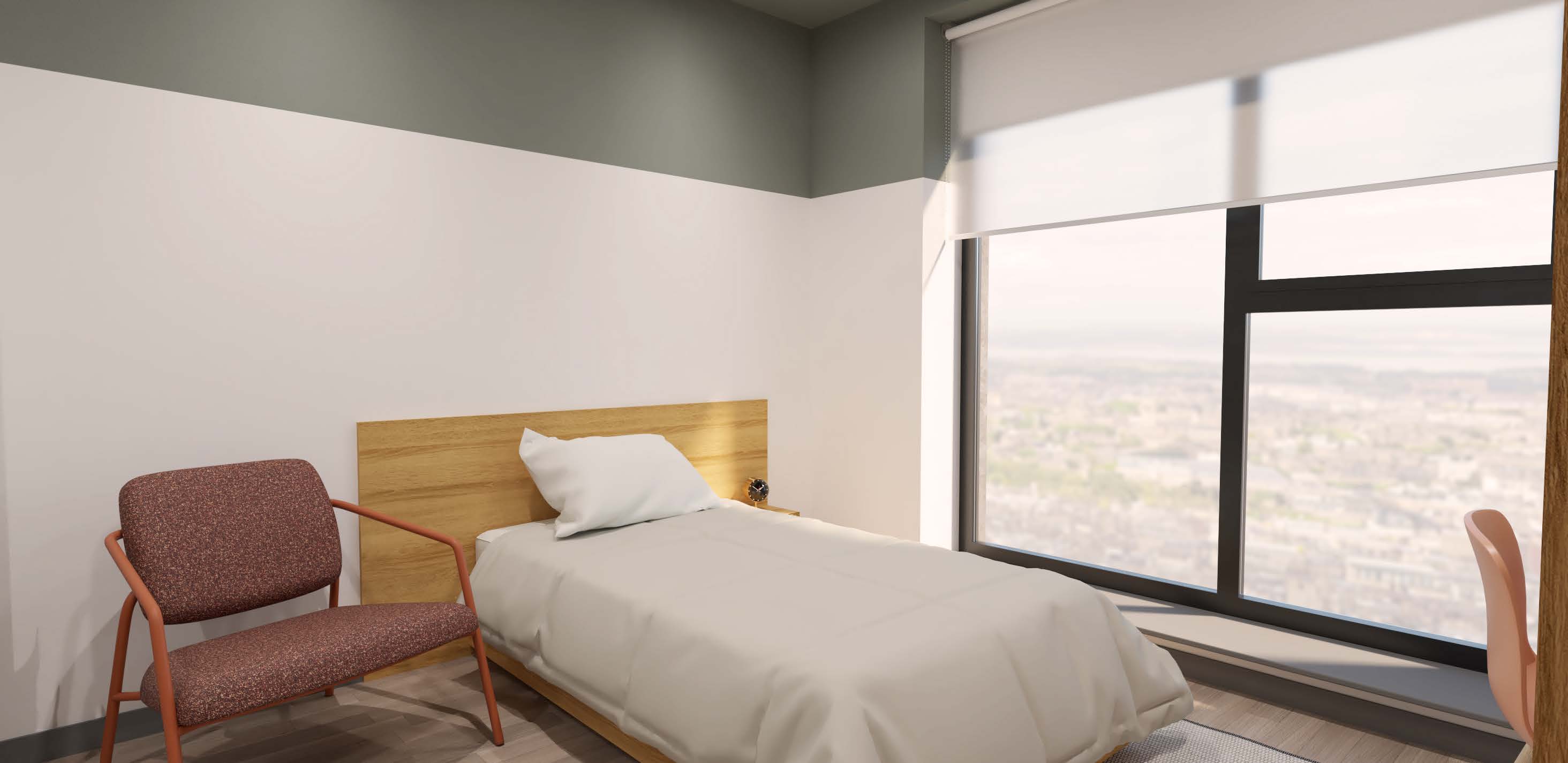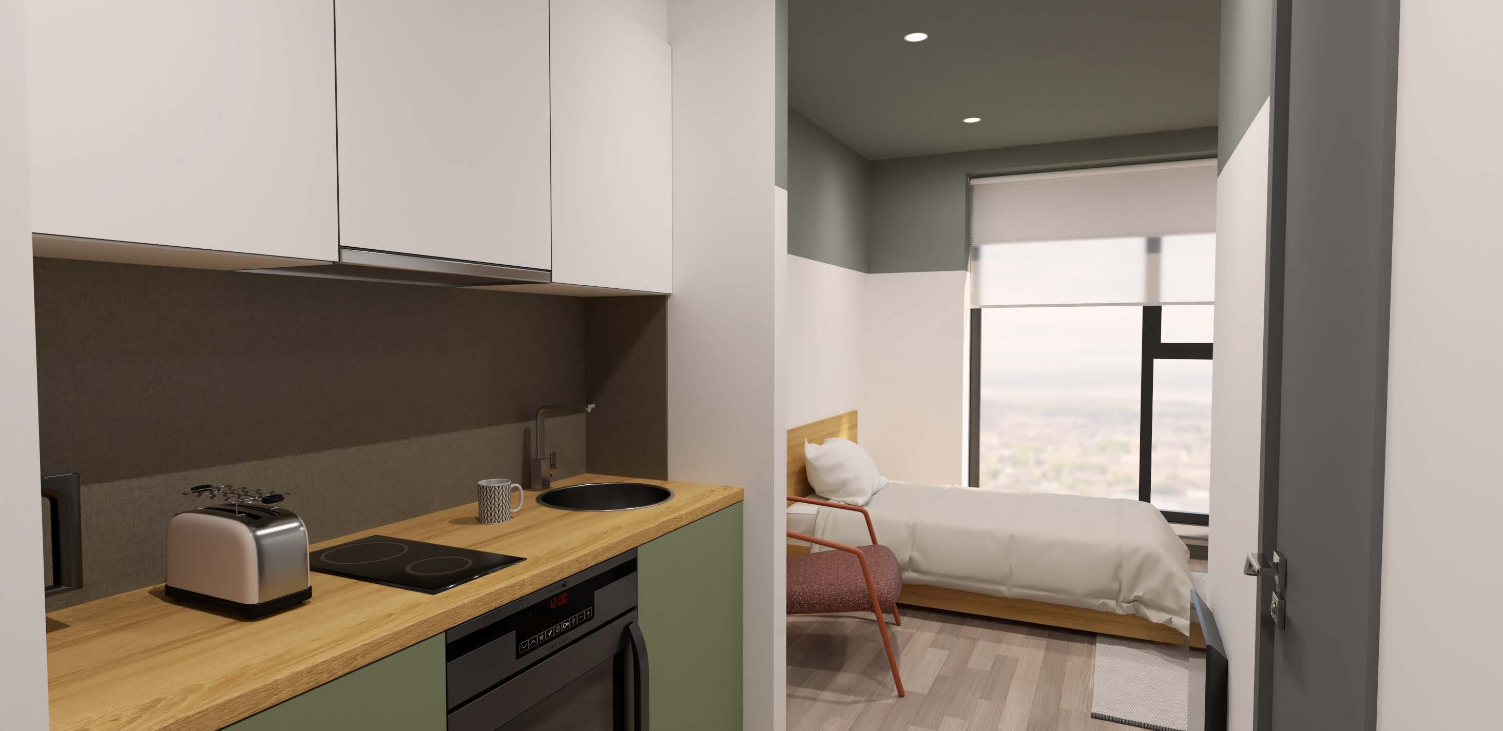 Weavers' Hall is Queen’s brand-new student accommodation opening September 2026, offering 459 beds in the heart of Belfast City Centre. Students can choose from 361 en-suite bedrooms in shared apartments with a communal kitchen and dining area, or 98 self-contained studios for more independent living.