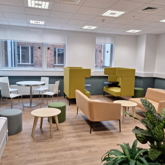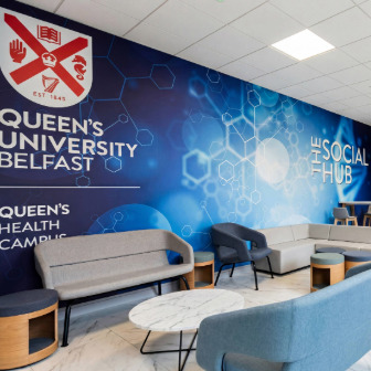 Located at Ground Level beneath the Stranmillis Road entrance to the Ashby Tower, the former Ashby Café and kitchen have been refurbished to provide a multi-use Ashby Student Hub with a communal kitchen area and four group study rooms. The main space is given over to informal seating and can be used for a variety of presentation purposes.