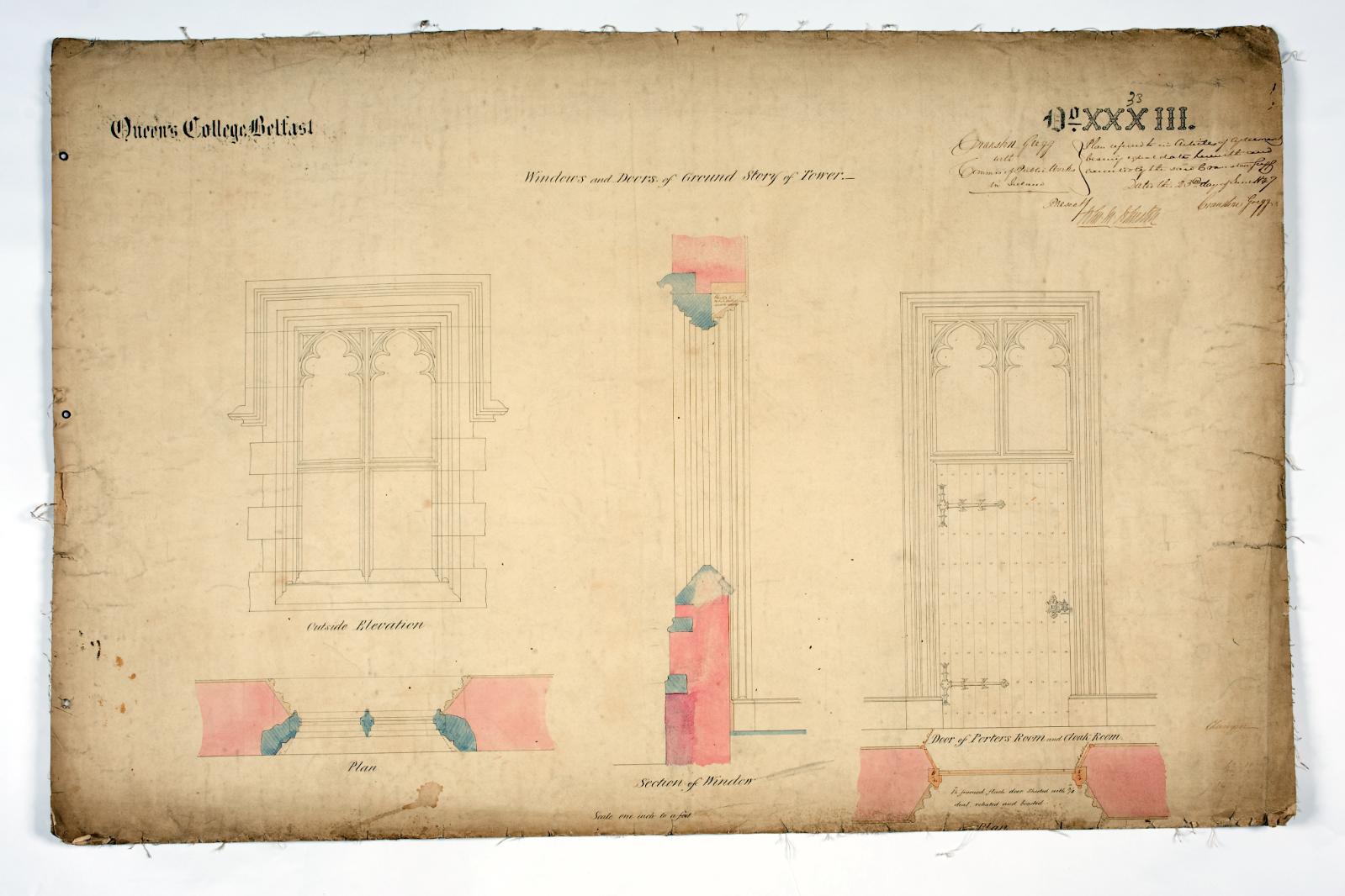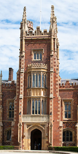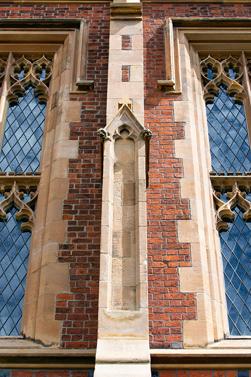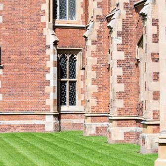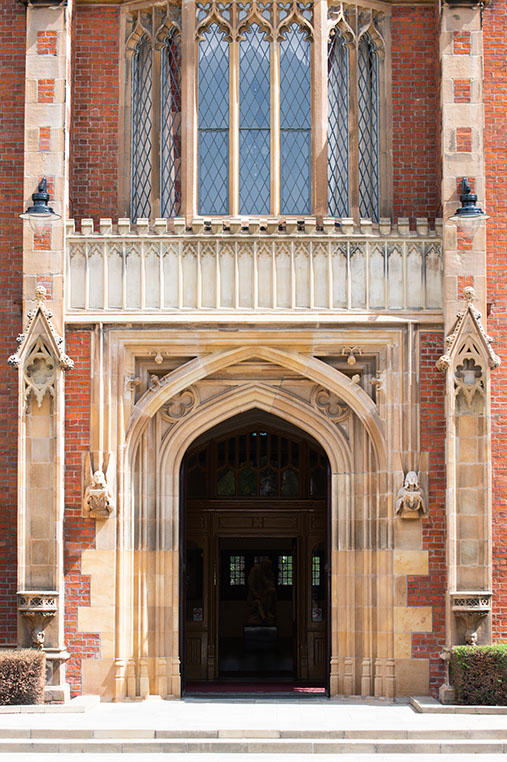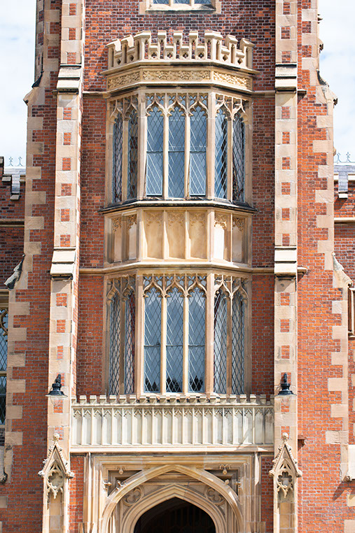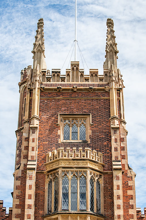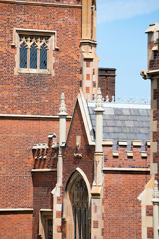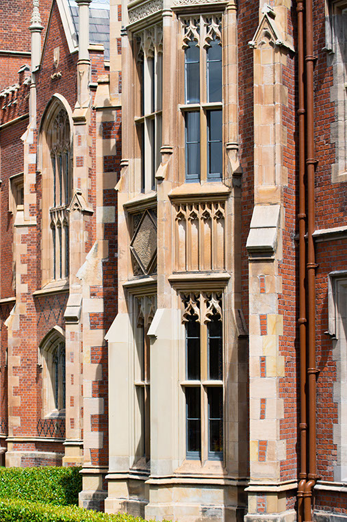 The building is an outstanding example of Tudor-Gothic architecture and of early Victorian architectural achievement in Ulster. Victorian architects often used historical associations to create authority and presence. Lanyon used the Tudor-Gothic style to reflect the medieval foundations of ancient universities such as Oxford and Cambridge, thus providing an appropriate reference for a new college and seat of learning with high ambitions. The building is built in mellow, patterned brick with stone trim on the buttresses and parapets and diamond-paned windows. The long front façade is boldly massed, sculptural and has a wealth of architectural detail.