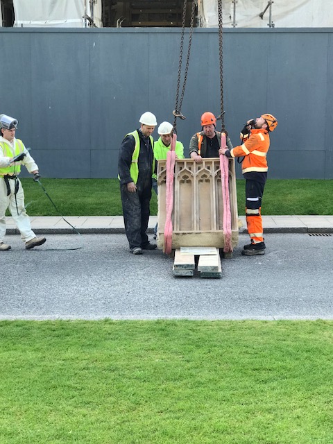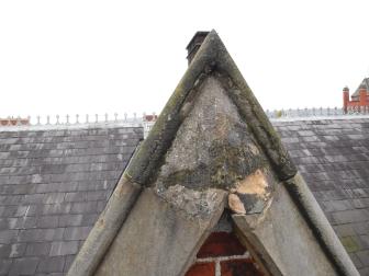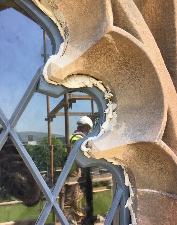 This highly intricate stonework takes the form of pinnacles, finials, crenellations and statuary. Giffnock sandstone was mainly used on the western front elevation between the north corner crenellated tower and the south corner crenellated tower. The north and south elevations, including the corner towers, are predominantly Scrabo sandstone. Previous emergency remedial works on the stonework, however, left a patchwork of repairs resulting in colour variation across the façade. During the conservation project the deteriorated stone was replaced. Individual pieces of replacement stone were inserted by highly skilled stone masons from S McConnell & Sons, and some of the intriguing gargoyles taking the rainwater off the building have been subtly repaired or in some instances imaginatively replaced. The most intricate stonework was carried out on the window surrounds and on the traceries and other details.
