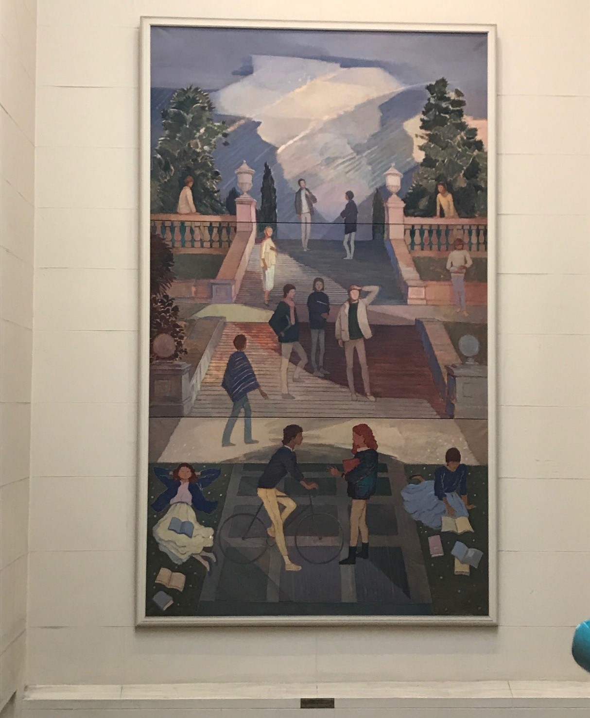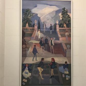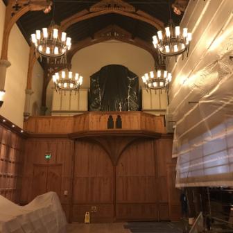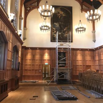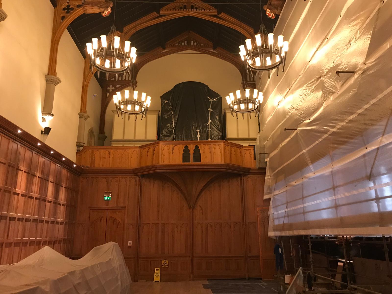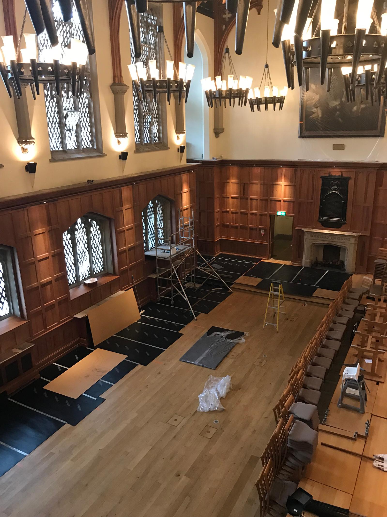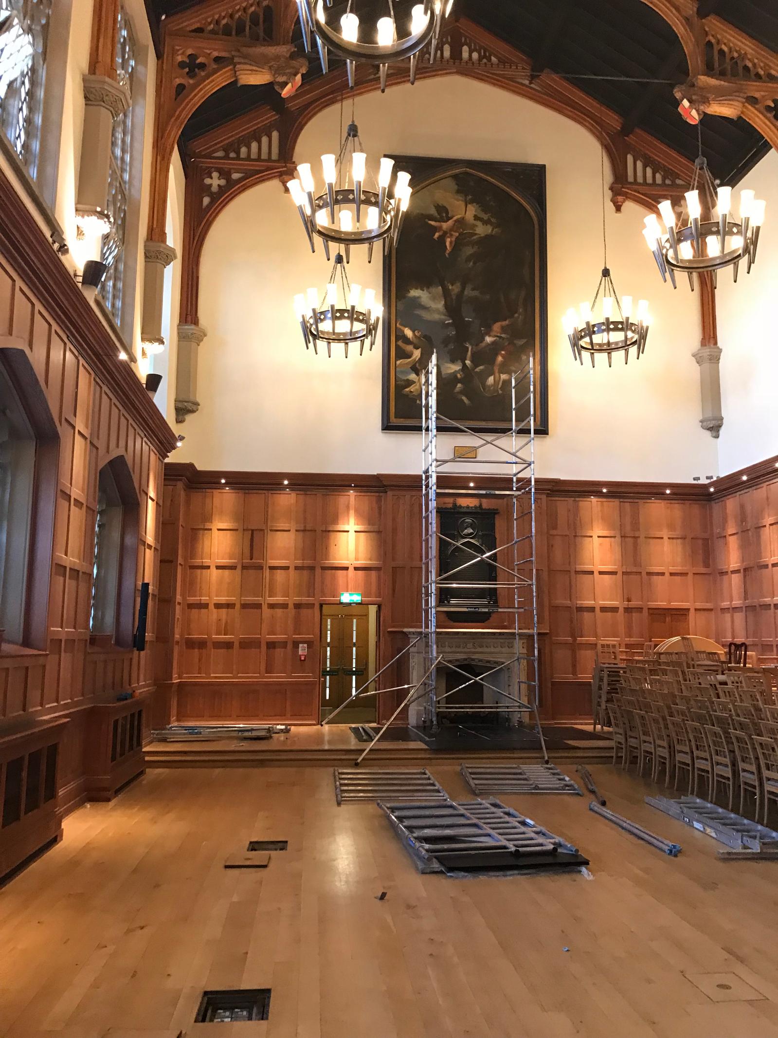 The Great Hall had been fully restored as a Millennium project in 2000 but as part of the Lanyon project needed refreshed. A full programme of painting and repair of damage to the flooring was carried out. A new carpet was also commissioned from Ulster Carpets. The brief was to take inspiration from the window tracery and maple leaf patterns in the Canada Room, and from the colours in the painting of student life by Cherith McKinstry (wife of conservation architect Robert McKinstry who carried out the original restoration of the Canada/Council Chamber in 1986) which hangs in the stairwell. In addition, the entrance to the Lanyon was refreshed and the front door newly repainted.