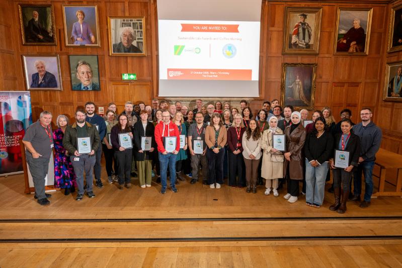 On Tuesday 21 October, the 4th annual Sustainable Lab Awards Ceremony took place in the Great Hall highlighting the efforts undertaken by 73 labs across Queen’s to achieve Bronze, Silver or Gold LEAF Accreditation. The Awards were opened by Professor Michael Alcorn, Associate Pro-Vice-Chancellor for Strategic Projects and Sustainability, and certificates were presented by Professor Alan Stitt, former Dean of Innovation and Impact (Faculty MHLS) and academic sponsor of the LEAF Programme.