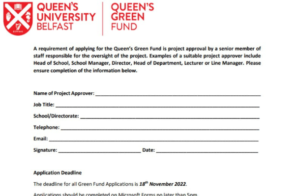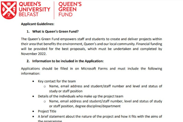 Queen's Green FundThe Queen’s Green Fund empowers staff and students to create and deliver projects within their area that benefit the environment, Queen’s and our local community. Financial funding of up to £2000 for each team will be provided for the best proposals.
