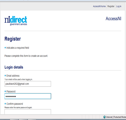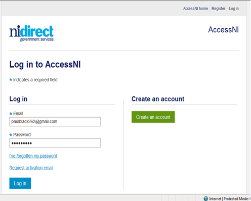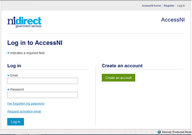 To complete an application form for an Enhanced check you will need to log in to your AccessNI account by typing in your email and password at the log in screen.