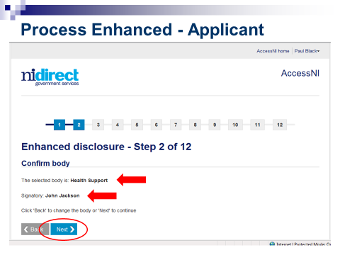You will be directed to the ‘Confirm Body’ screen and will asked to confirm that your application has been associated to the correct account. The ‘selected body’ must be Queen’s University and the ‘Signatory’ must be the name of the Queen’s Employee who will submit your application. If this information is not correct, please contact the University and advise them that the PIN code provided is incorrect. Do not move beyond this screen if the details are not correct as your personal details may be provided to the wrong person.