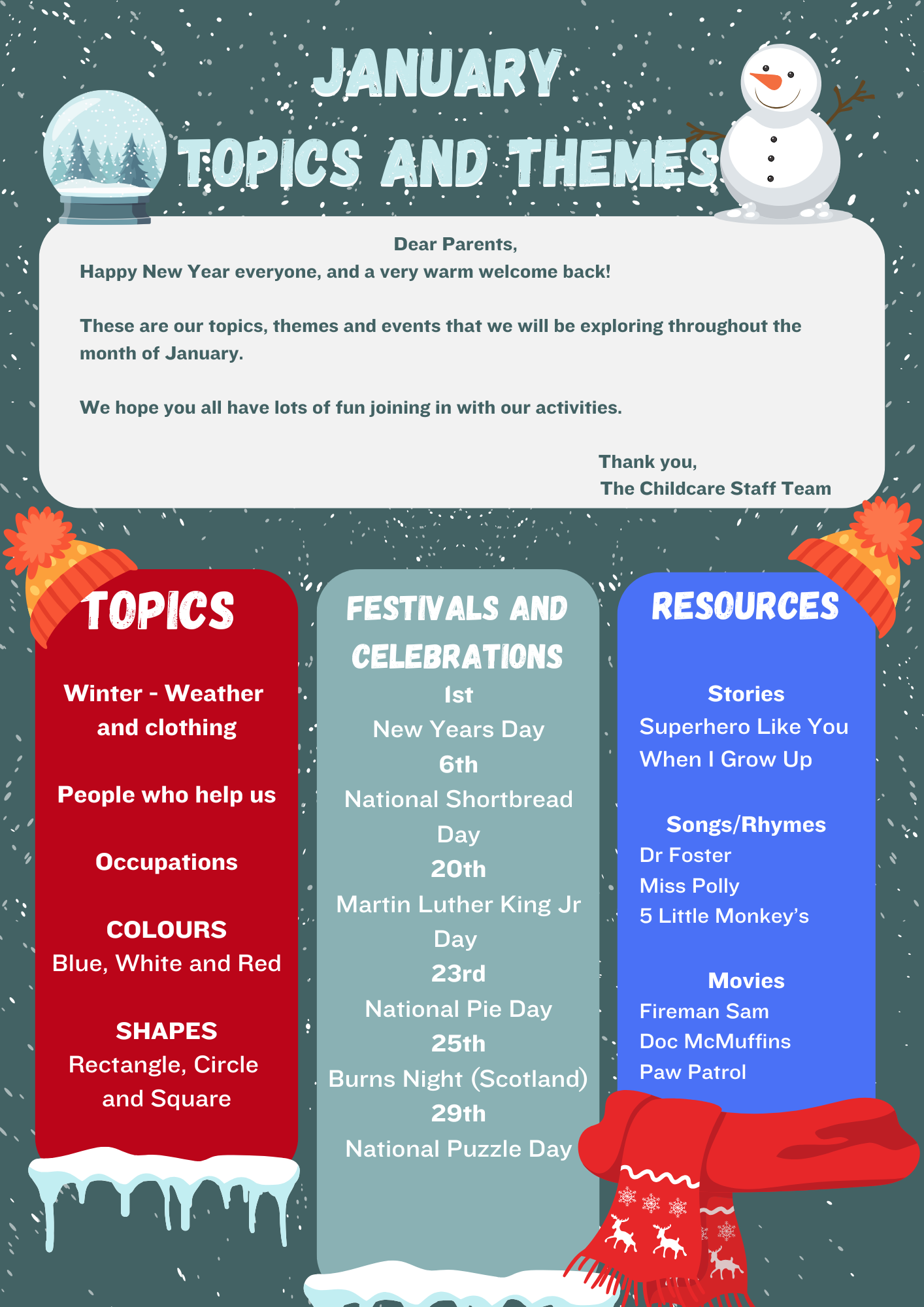 This month, we will be learning all about winter weather and clothing as well as learning about the people who help us, with us finally looking at occupations!