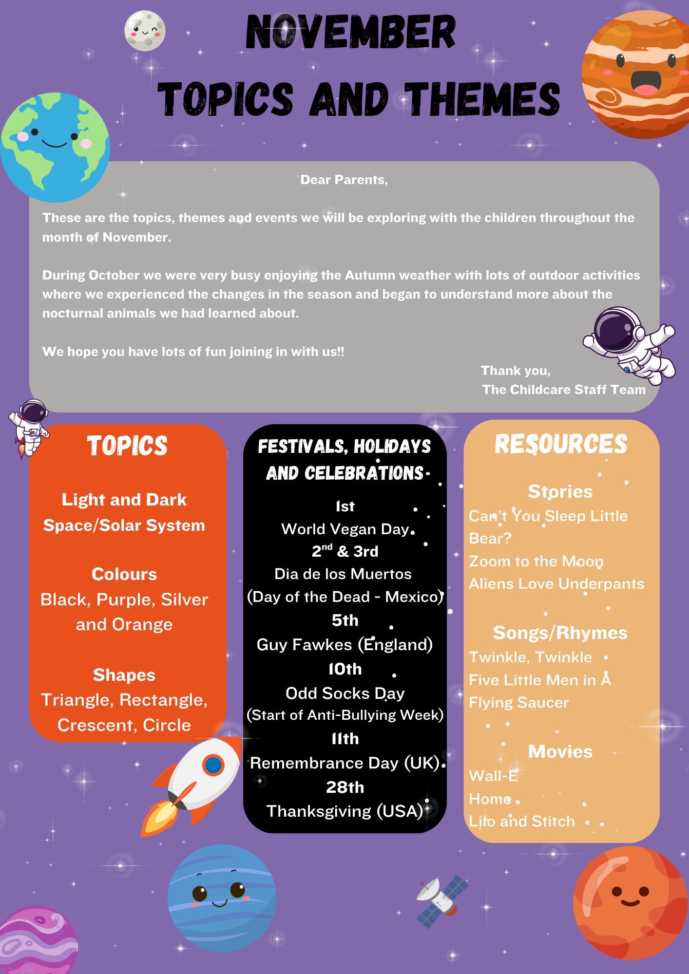 This month, we will be learning all about Light and Dark as well as exploring Space and the Solar System!