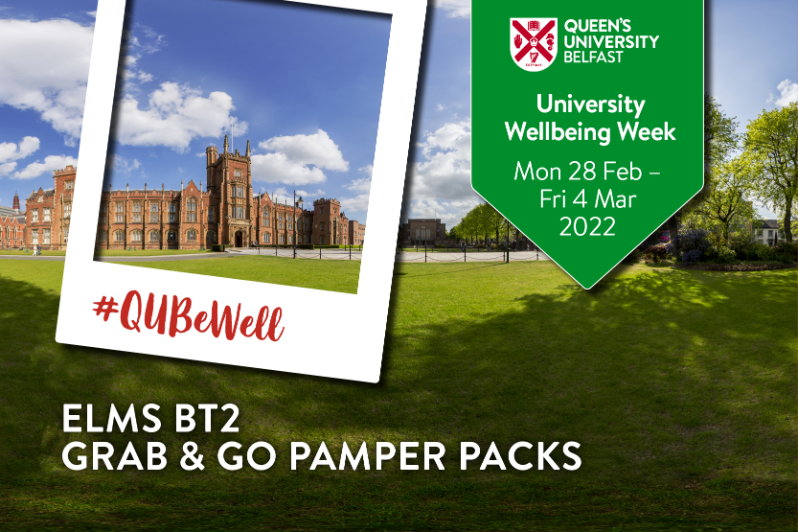 Residents of BT2 can email a.caldwell@qub.ac.uk to sign up for their Grab & Go Pamper Pack full of goodies to help them enjoy a night of self-care, pampering, and mindfulness.