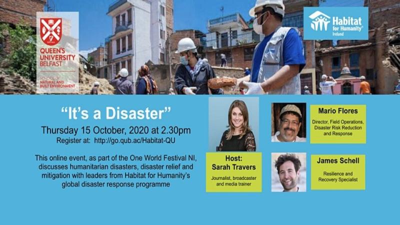 As part of One World Festival NI, Habitat and Queen's University Belfast are running a webinar entitled "It's a Disaster" on Thursday 15 October at 2.30pm.