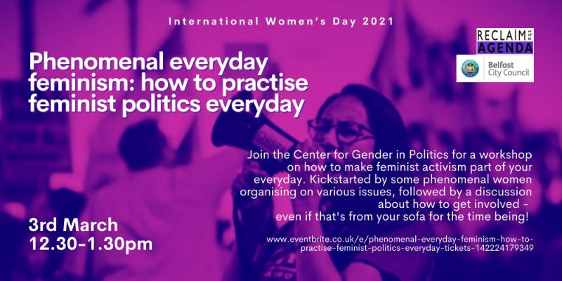 Join the Center for Gender in Politics for a workshop on how to make feminist activism part of your everyday. the conversation will be kickstarted by some phenomenal women organising on various issues, followed by a discussion about how to get involved - even if that's from your sofa for the time being! Absolutely no prior experience necessary, this space is for you to find out more about some of the many campaigns for gender justice locally, and how to go about actually doing feminism.
