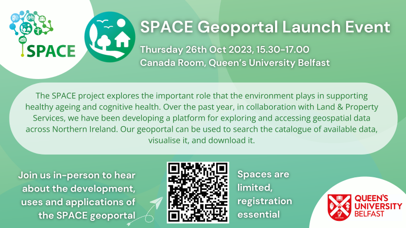 The SPACE project explores the important role that the environment plays in supporting healthy ageing and cognitive health. Over the past year, in collaboration with Land & Property Services, we have been developing a platform for exploring and accessing geo-spatial data across Northern Ireland. Our Geo-portal can be used to search the catalogue of available data, visualise it, and download it.