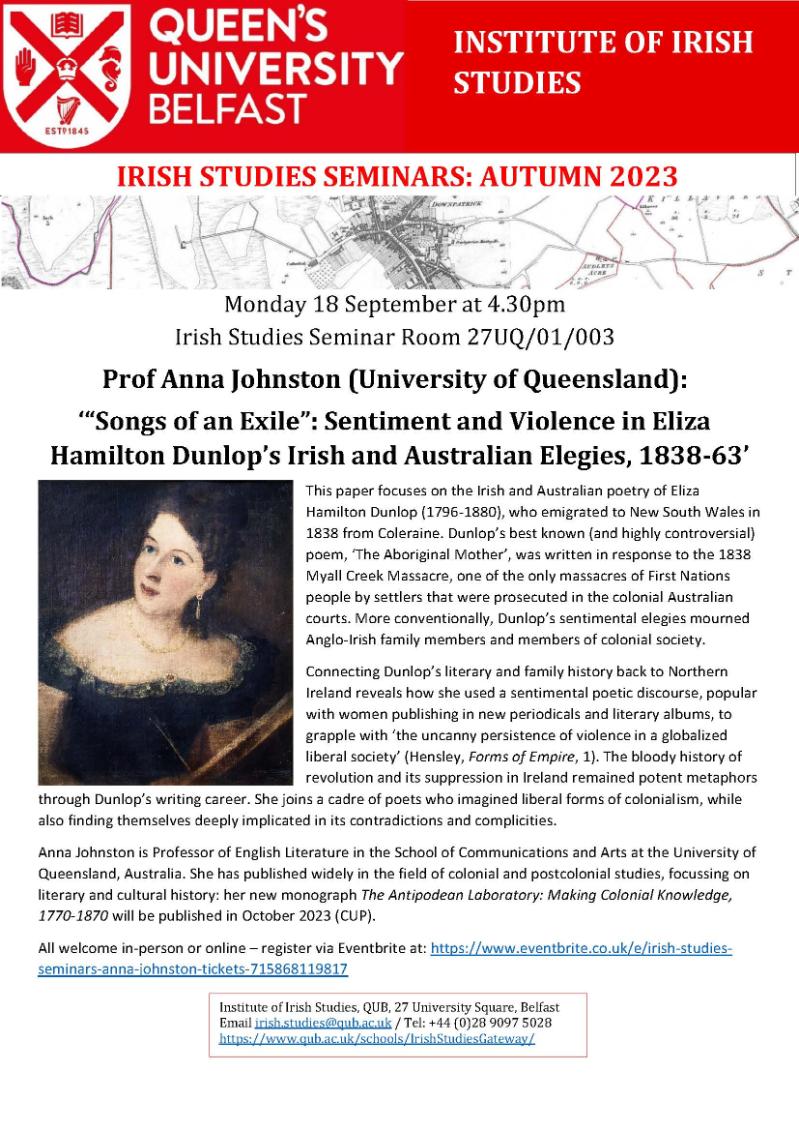 Prof Anna Johnston (University of Queensland): ‘“Songs of an Exile”: Sentiment and Violence in Eliza Hamilton Dunlop’s Irish and Australian Elegies, 1838-63’