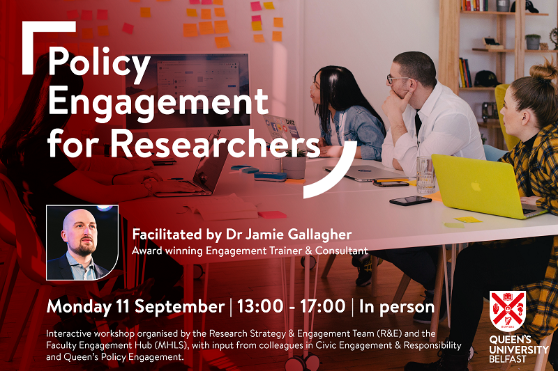 The Research Strategy & Engagement team (Research & Enterprise Directorate) alongside the Faculty Engagement Hub (Medicine, Health & Life Sciences) with input from colleagues in Civic Engagement & Social Responsibility and Queen's Policy Engagement, are delighted to offer this interactive workshop for researchers which will be facilitated by engagement consultant, Dr Jamie Gallagher, an award-winning freelance communicator and engagement professional with ten years’ experience in the delivery and evaluation of quality engagement projects. This workshop will be held in person on Monday 11 September 2023 from 1.00 pm – 5.00 pm. Participants will explore the legislative process and how they can work to influence both policy and policy makers, exploring how to engage with the parliamentary processes, from contributing to a committee meeting to preparing briefing notes and will draw on successful (and unsuccessful) examples to help you to map your own policy engagement journey.