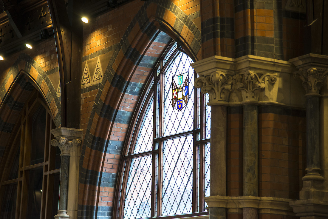 The crest of the then ‘Royal University of Ireland’ can be seen on the South Window. It is composed of the crests of Ireland’s four historic provinces: