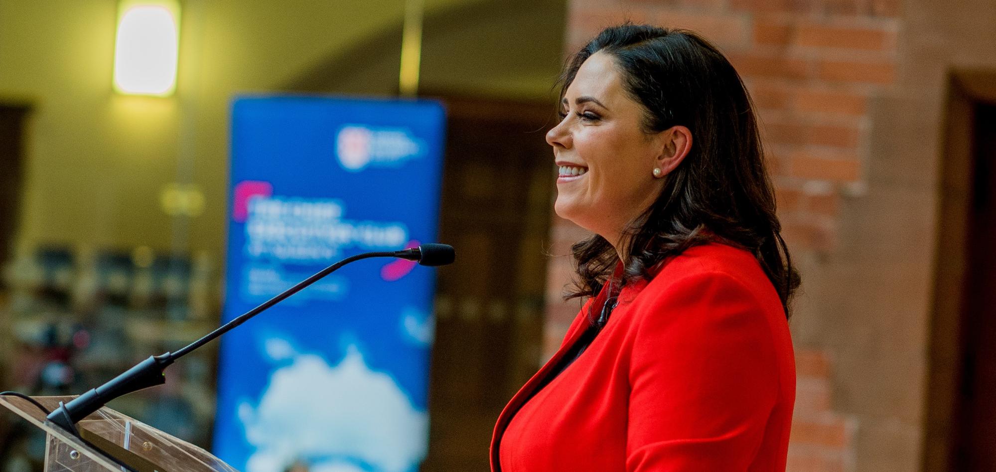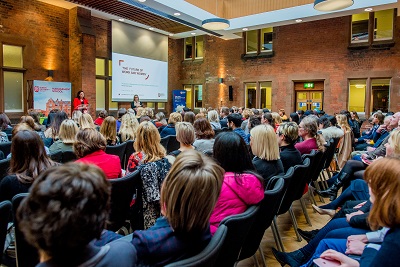 There was a excited crowd of staff, students and members of the public in the audience at the magnificent Isdell Courtyard, in Queen's University Beflast's Riddel Hall to hear Dr Sands lecture, 'The Future of Work and Women'.