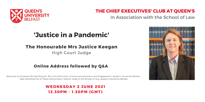 Click here to watch againClick here to watch again: Justice in a Pandemic | 2nd June 2021 : Chief Executives' Club Lecture and Online Discussion with The Honourable Mrs Justice Keegan, High Court Judge and QUB Judge in Residence
