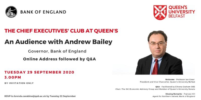 The Chief Executives’ Club at Queen’s were delighted to host an Audience with Andrew Bailey, Governor of the Bank of England. This event was broadcast live and included a Q&A session with members of the Chief Executives’ Club, friends of the University and invited press.