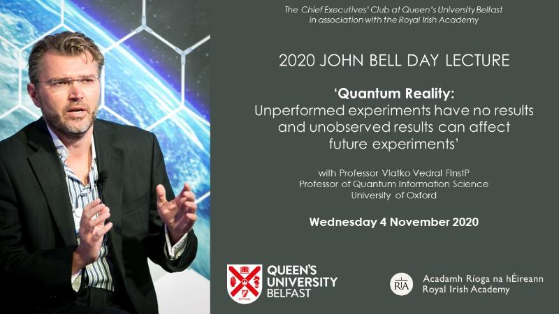 The Chief Executives' Club at Queen's University Belfast in association with the Royal Irish Academy were delighted to host Professor Vlatko Vedral FInstP, Professor of Quantum Information Science, University of Oxford to give the 2020 John Bell Day Lecture.