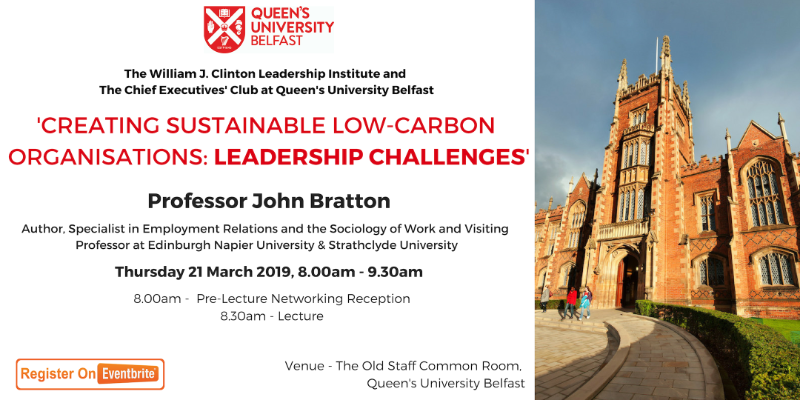 The William J. Clinton Leadership Institute and The Chief Executives' Club at Queen's University are hosting a breakfast lecture titled 'Creating Sustainable Low-Carbon Organisations: Leadership Challenges' with Dr John Bratton.