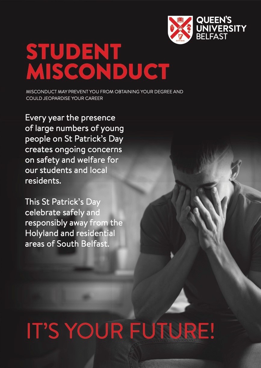 As a Queen’s student, you have a responsibility to ensure that your behaviour does not have an adverse impact on your fellow students, your neighbours or the University – in line with the University’s Student Charter. It is important to remember that engaging in misconduct, whether on or off campus, may prevent you from obtaining your degree and could jeopardise your career. Find out more on the Neighbourhood Engagement website.