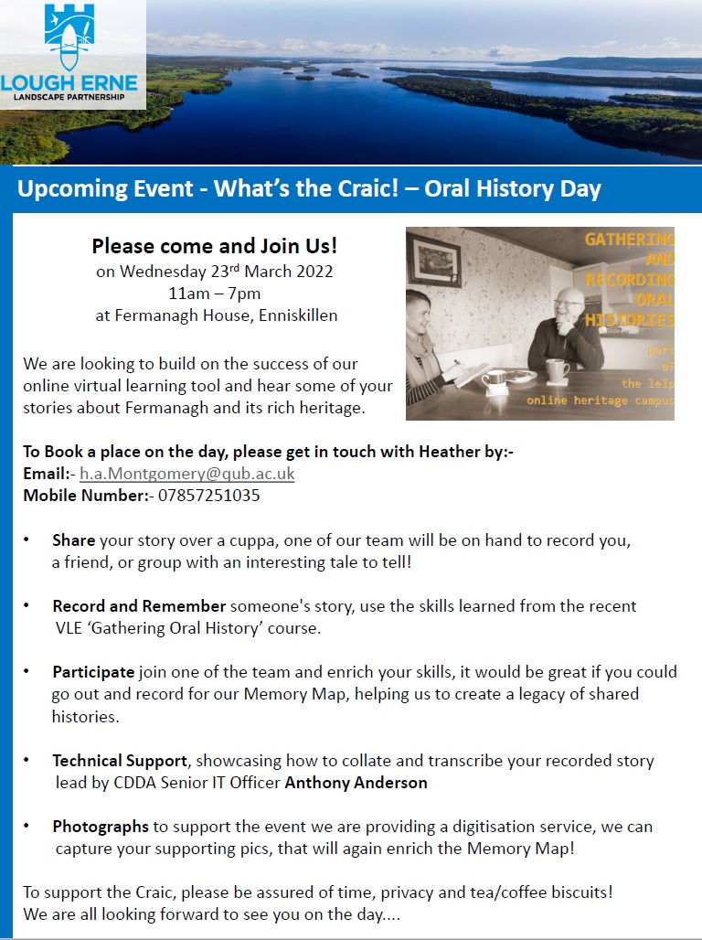 Wherever you go in the world, you’re sure to meet people who tell the most wonderful stories; Well, Fermanagh is no exception, and given the response we have had to our Oral Histories online learning tool kit, there is no shortage of folk who want to gather these stories, memories and wonderful hidden histories of Fermanagh. It has been a pleasure to have engaged with you all, via our VLE, but also fantastic to have met some of you (virtually), via our weekly MS Teams surgeries. We would like to encourage you to now come along and undertake some Oral History gathering for real! We are also delighted to have on board Mr Anthony Anderson, a Senior IT Officer from CDDA, who will look to help and advise you on transcribing and making ready your recordings for upload to the Memory Map.