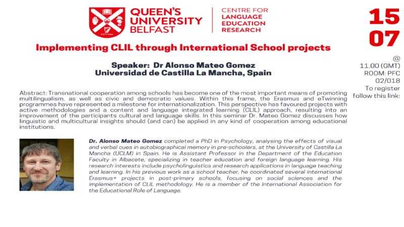 Abstract: Transnational cooperation among schools has become one of the most important means of promoting multilingualism, as well as civic and democratic values. Within this frame, the Erasmus and eTwinning programmes have represented a milestone for internationalization. This perspective has favoured projects with active methodologies and a content and language integrated learning (CLIL) approach, resulting into an improvement of the participants cultural and language skills. In this seminar Prof Mateo Gomez discusses how linguistic and multicultural insights should (and can) be applied in any kind of cooperation among educational institutions.
