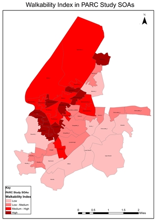 This images shows a GIS based composite Walkability Index calculated for the PARC Study area.