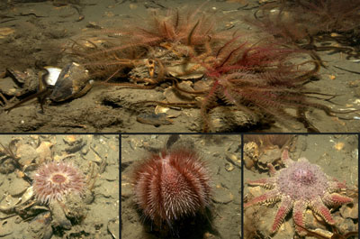 Horse mussel reefs are considered to be one of the most diverse marine ecosystems in Europe. Top photo: Modiolus clump with Antedon bifida; bottom images, from left to right: Dahlia Anemone Urticina felina, sea urchin Echinus esculentus and starfish Solaster paposus (Photo: Bernard Picton).