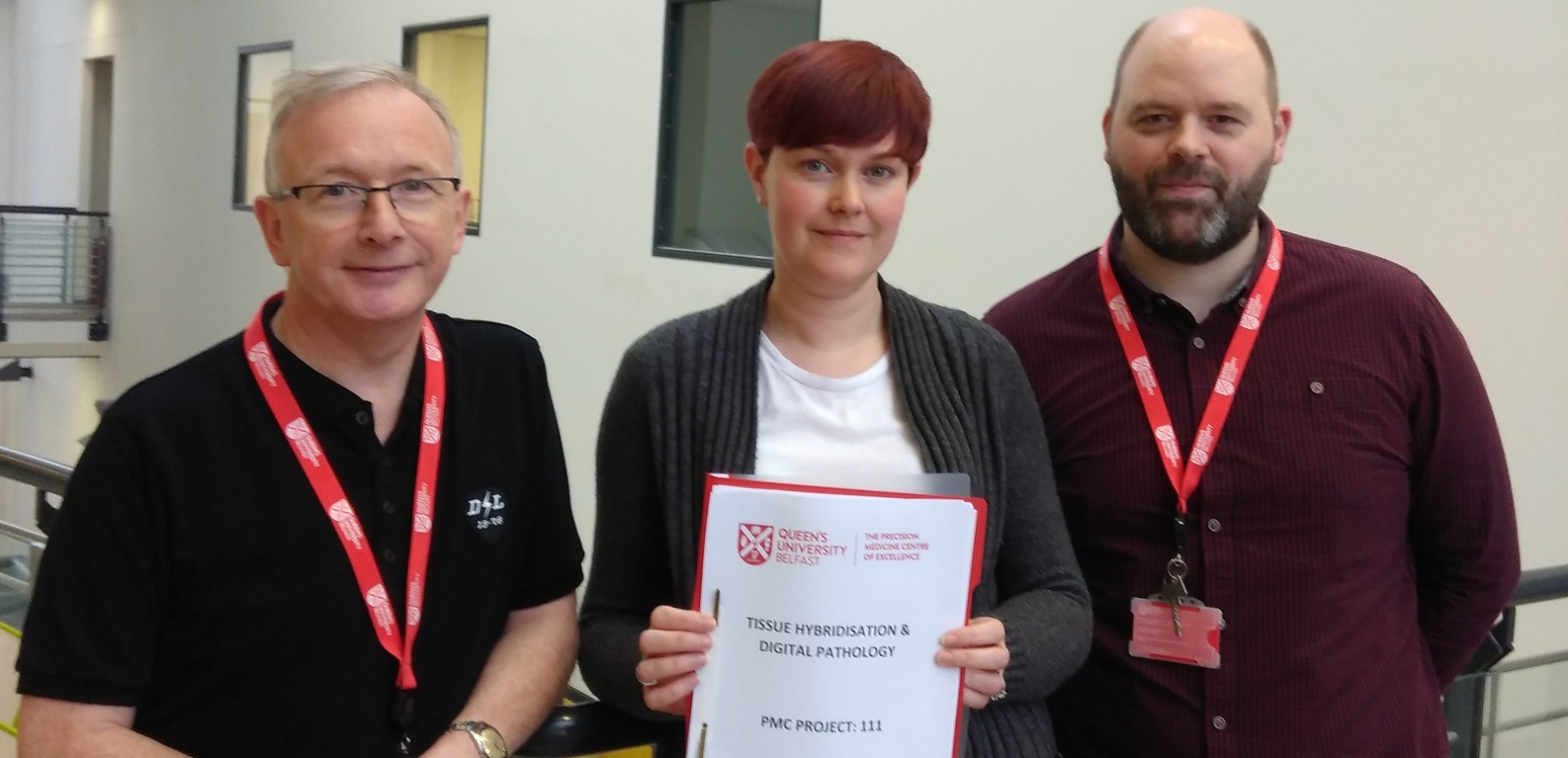 Members of the Tissue Hybridization and Digital Pathology team – Dr Perry Maxwell, Ms Leanne McIlreavey and Dr Matt Humphries – mark the successful completion of their first project within the new Precision Medicine Centre of Excellence laboratory.