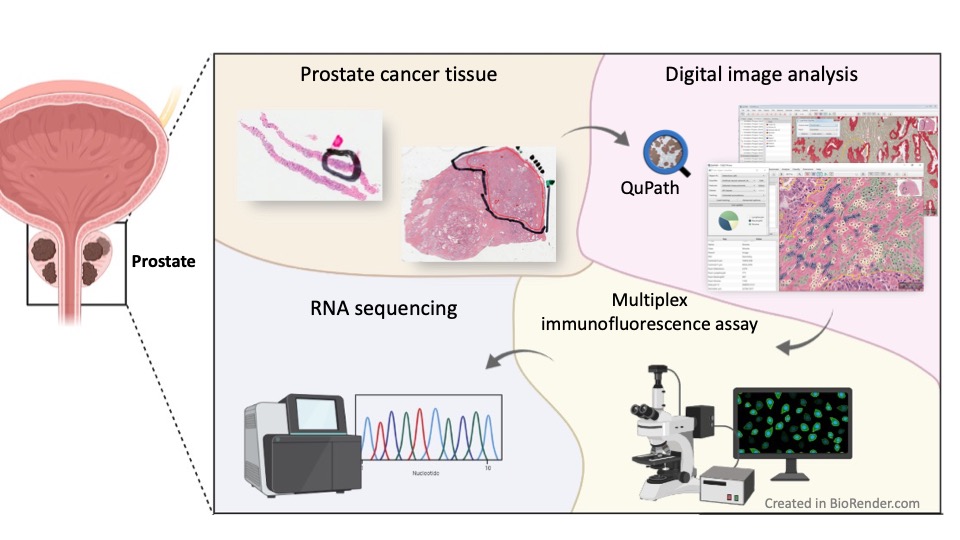 Prostate cancer tissue is retrieved from prostate cancer patients. Inflammation and related pathological features are assessed using QuPath software, for digital image analysis. An immunofluorescence assay will be performed to identify the multiple types of tumours infiltrating lymphocytes simultaneously, and RNA sequencing is used to identify genes expressed in different cells within the tumour. This combination of strategies will allow identifying biological functions and precise features when evaluated using integrative computational methods.